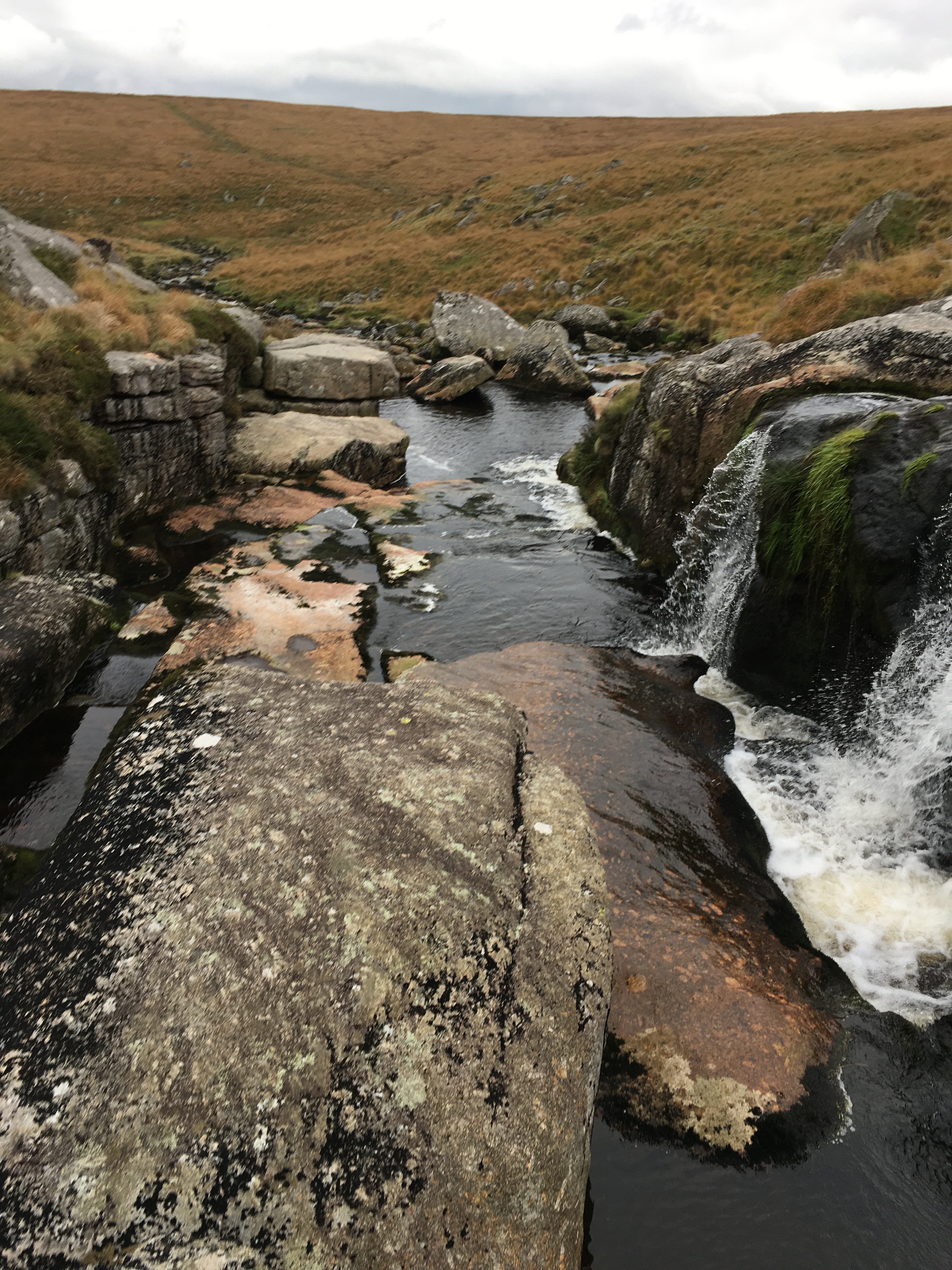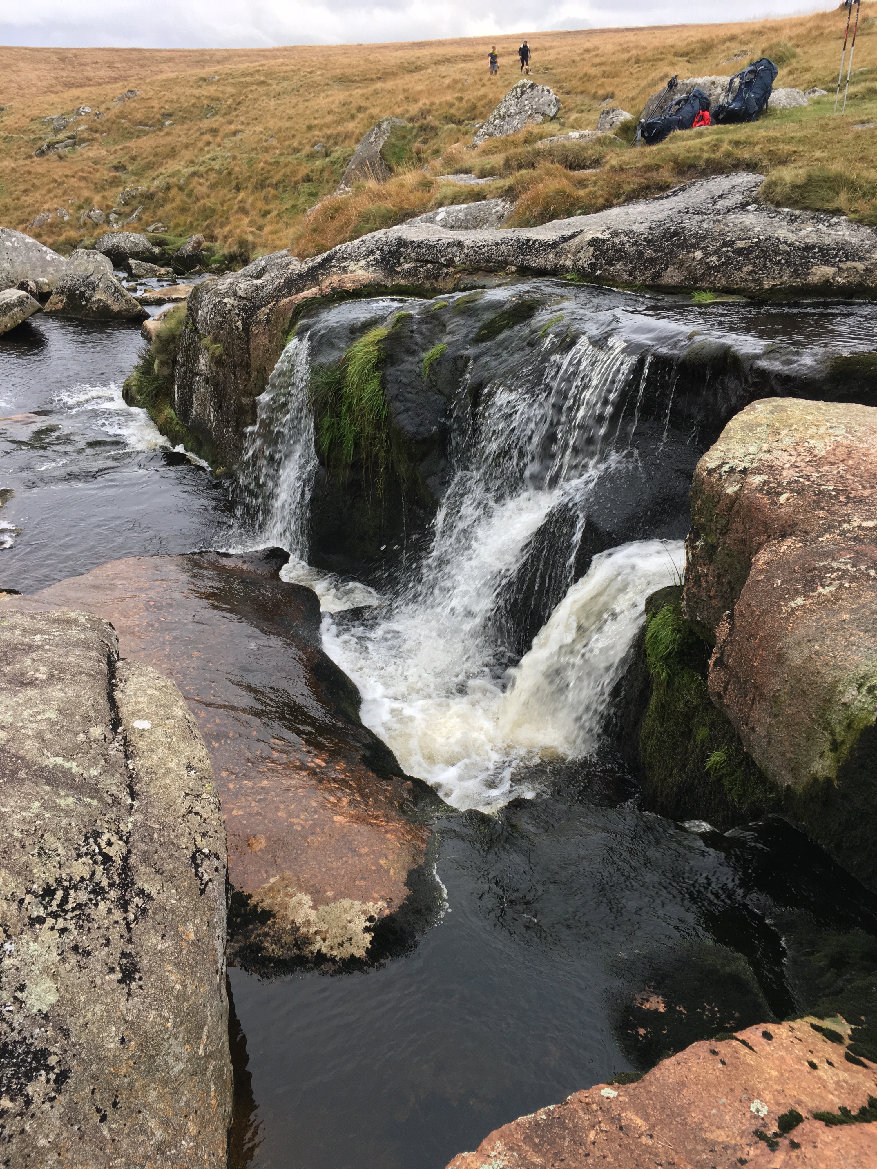 We were a bit later than originally intended and so took the direct route to Postbridge by walking straight down then road. Turned right just past the pub and followed the East Dart river paths which in the main were non existent and very boggy! The waterfall was a beautiful spot where we stopped for a short while before moving on to try and find a suitable spot to camp for the night.