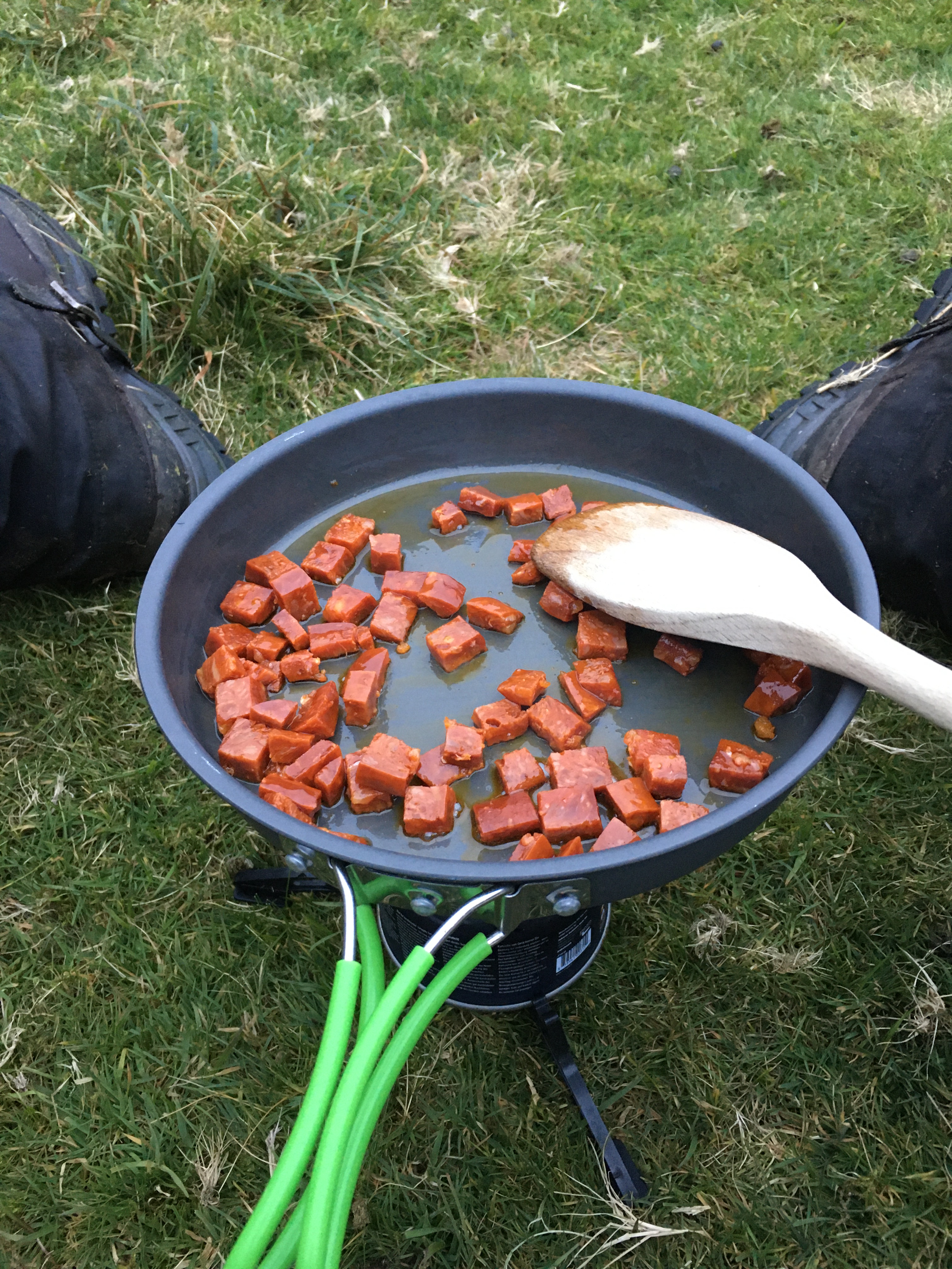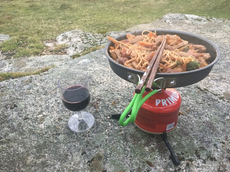 The afternoon wore on and we were just starting to get concerned as to whether we would find a flat dry spot to camp before dark and we came across such a perfect spot. Just enough flat ground on nice spongy grass right by the river and sheltered from the wind. We set up camp and cooked dinner. One ritual we have is to always have booze and cheese after dinner and tonight was no exception with some Stilton washed down with single malt whisky!