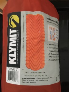 My sleeping mat is a Klymit which has a thermal lining and is very comfortable and I don’t roll off it either, essential to have the lining when you are doing a bit of three or four season camping although you can always supplement this slightly by utilising an aluminium foil blanket, the type you get at the end of a marathon etc and put that on the floor first which really does work a treat.