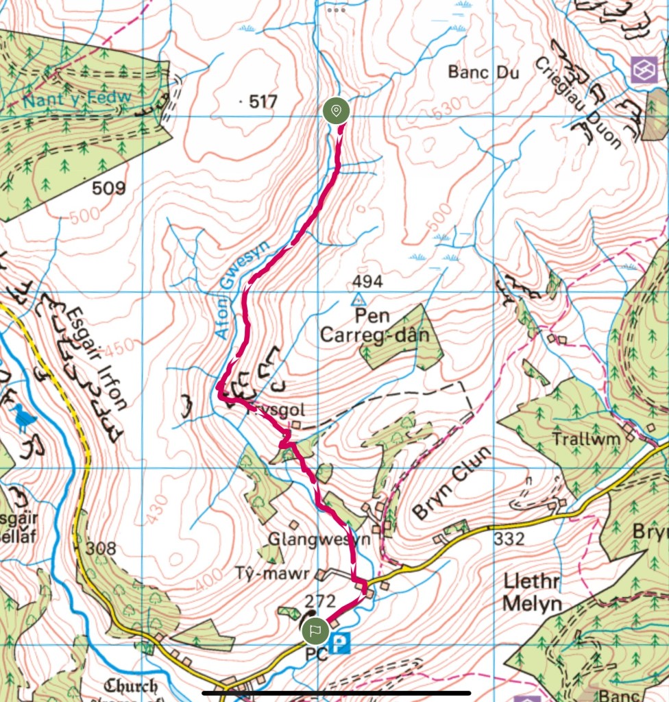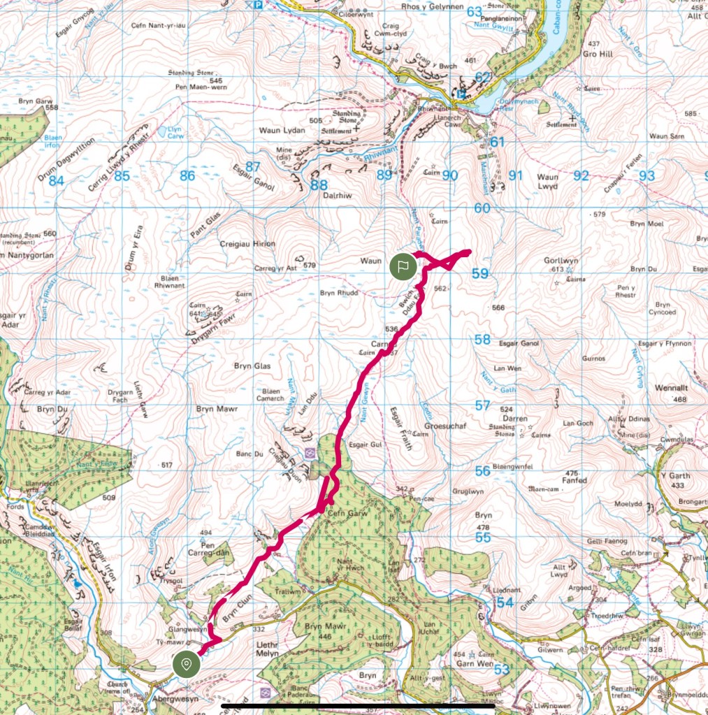 A solo and possibly the most challenging walk and wild camp that I have completed. The plan was to park in Abergwesyn a bit west of Builth Wells and go and explore the Nant Paradwys valley, hopefully finding a spot to pitch for night 1 with a view down to the Caban Coch Resevoir and then visit Carreg yr Ast and Drygarn Fawr as a couple of highest points in the area before making my way down the valley following Afon Gwesyn, as I had read an articulate about a wild camp half way down next to a waterfall which would leave me a short walk on day 3 back to the car.