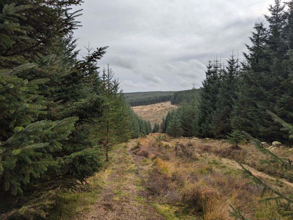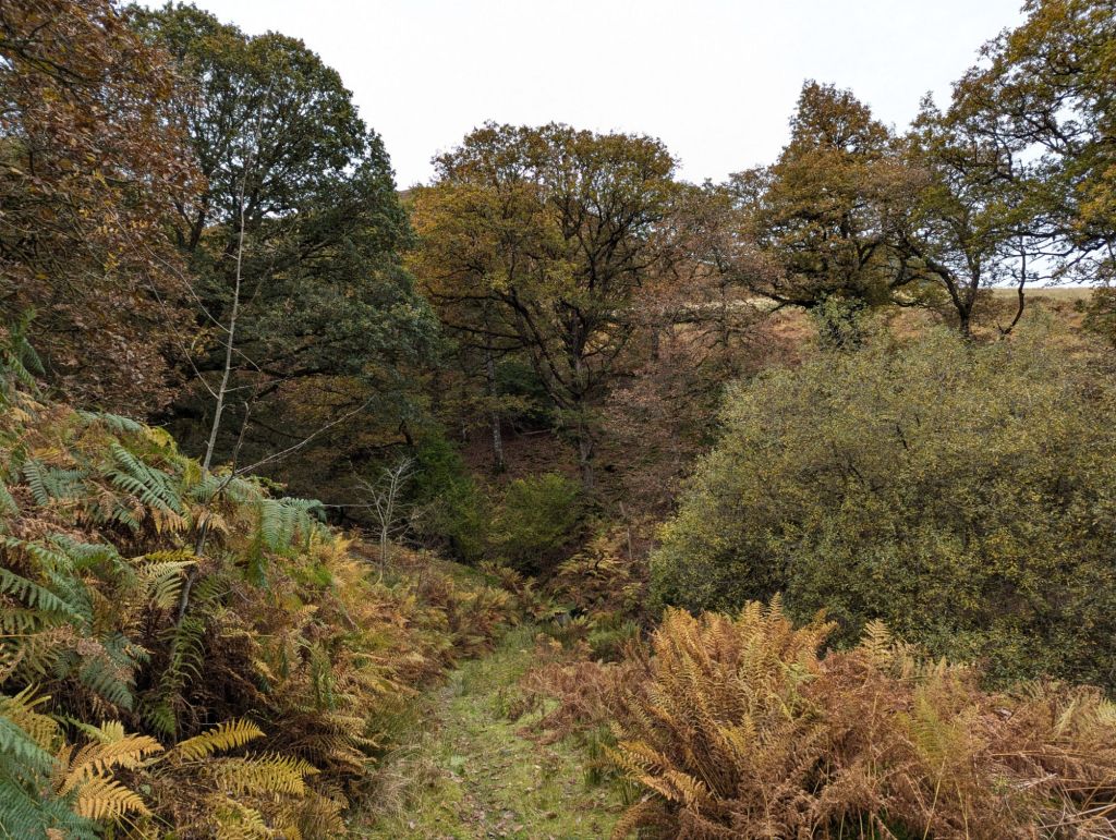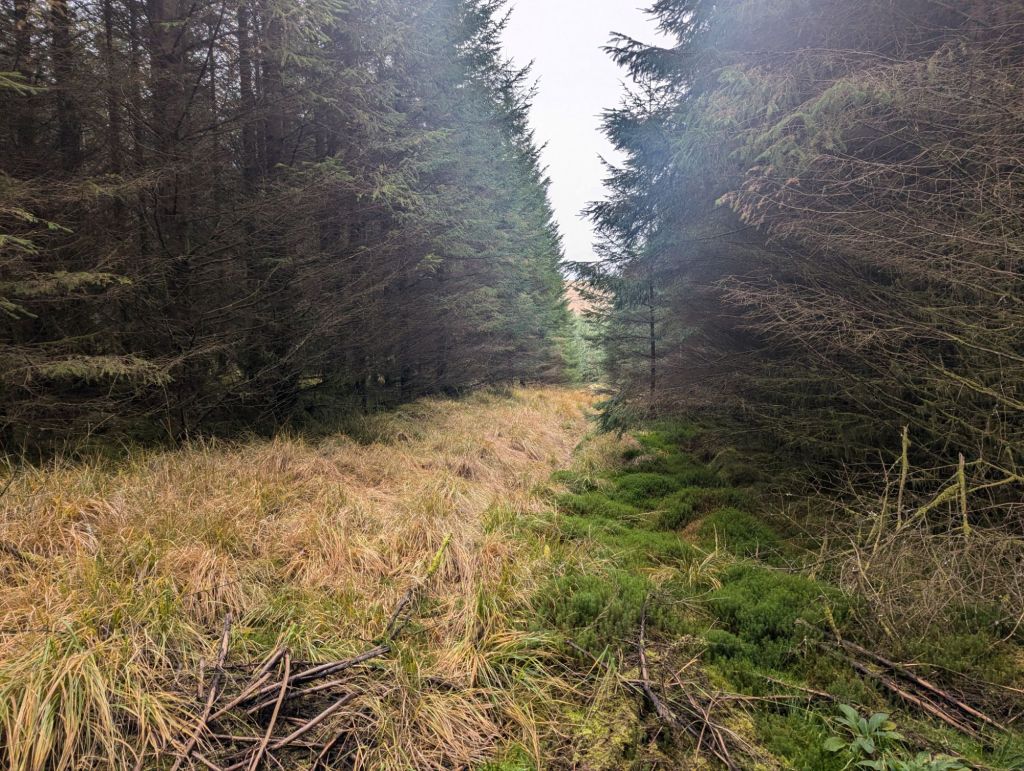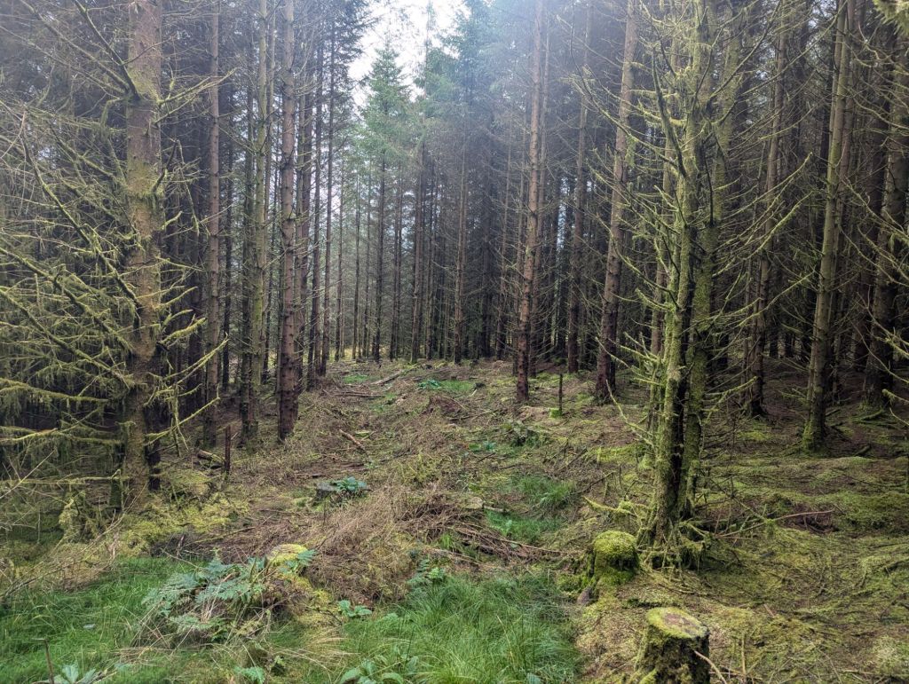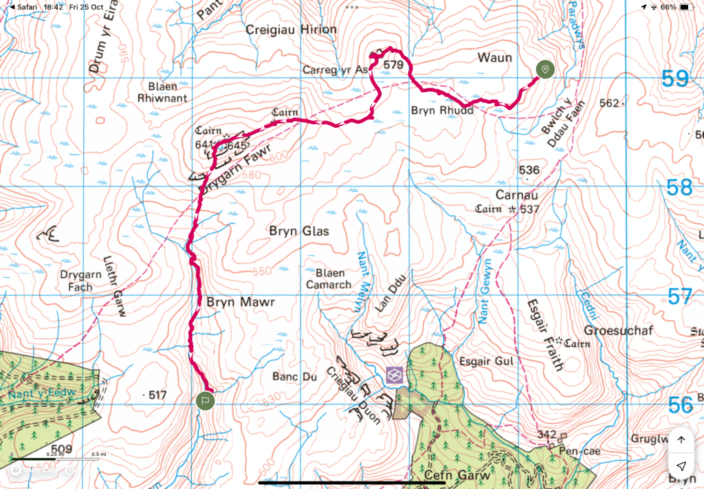 I did visit those places but it was not exactly as planned or how I thought it would be…. There is a clear path on OS Maps that takes you up through a Forest and along the Nant Paradwys Valley to the end of the Caban Coch Resevoir but in reality once I reached the forest the paths ceased to exist. The way into the forest was no longer accessible with the entire length fenced off which meant quite a diversion to find a way in, once in the paths were so overgrown and messed up by forestry work that they were almost impassable and very difficult to navigate. Once through the Forest it looked like there may be a path again taking me up onto the moorland but it didn’t last long and was probably the last time I would see any form of path until a short section on day two and the final bit back on day three.