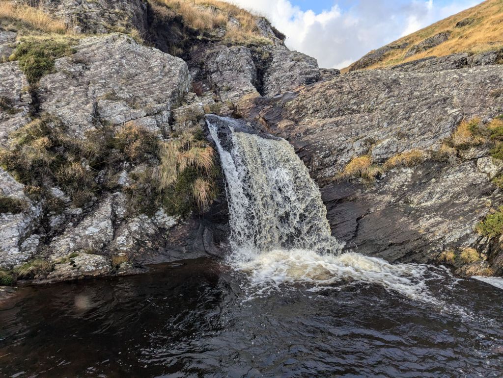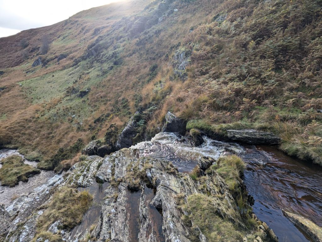 The walk across to the non existent path and then to Carreg yr Ast through even worse conditions than day 1 (I thought I may disappear into the bog never to be found at times…) took me nearly two hours and it is less than 1.5 miles… having reached it I could see a quad bike track out to what looked like a path of sorts even though that was not marked on OS maps and that made for quite a nice walk across to Drygarn Fawr in a short time. The weather had also improved and I had a nice lunch sitting in the sun. I also believed that maybe at last I would have a path of sorts to follow to the valley and along side Afon Gwesyn to my intended campsite for night 2. Wrong….. the quad bike track did take me almost to the top but then it became a complete nightmare with the conditions underfoot even worse (if that was possible) than I had previously experienced and it took me over two hours to travel the 1.4 miles to the site. At least with about 300m to go I had seen a good plan B if the intended spot wasn’t any good, in reality it was probably a better spot but despite only being 300m away I was too tired to struggle 20 minutes back to it and the waterfall site was actually okay anyway.