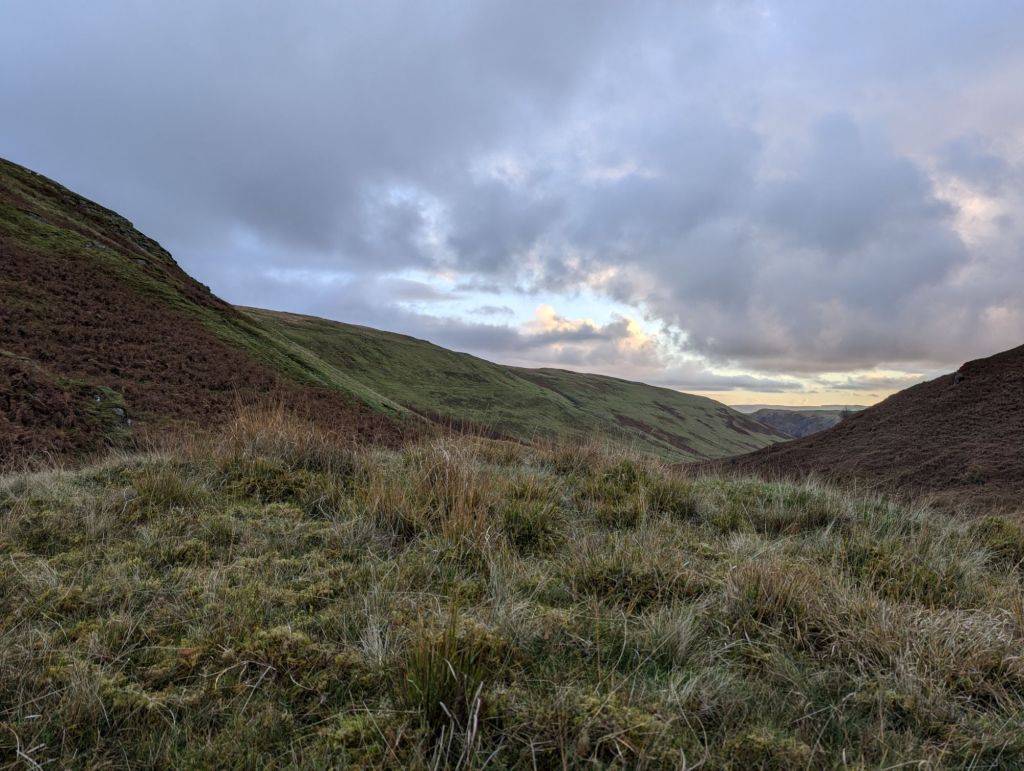 I had read that the ground was mainly marsh and bogs with tuffets (?) of grass that was very difficult to navigate and walk through, but I was planning on sticking to the path… as the path didn’t exist I found my self in leg breaking ground that took me a good hour to travel just a mile. I knew I was running out of time before dark and I wasn’t anywhere near a potential view of the Resevoir and I hadn’t seen a single place that would be suitable (or even not very suitable) to pitch for the night. After a lot of searching (and starting to get quite concerned) I finally managed to find a grassy spot on a rocky lump at about 530m which was more exposed to the wind than ideal, but I had the trusty Terra Nova Pioneer 2 so I knew that would be okay, if a bit noisy!