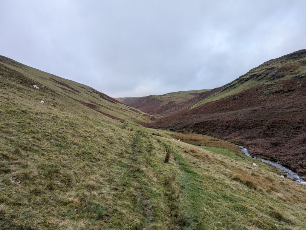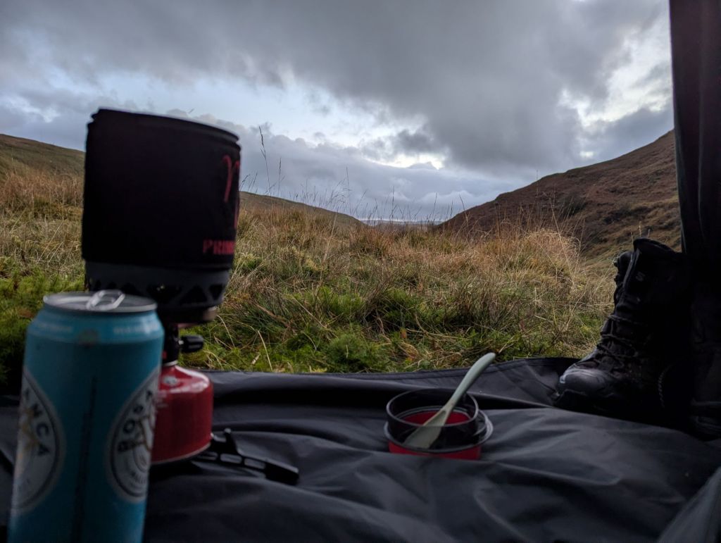 Day 2 started wet and I was in no hurry to move as I figured I only had a relatively short walk of about 4 miles to my next camp spot, little did I know….. I had breakfast sitting in the tent out of the wind and rain, lazed about while it carried on raining, had a mid morning snack and finally got packed up and on my way by about 11:30am…. I know there is a bit of a rule about pitch late (did that!) and leave early but since I was miles from anywhere and I hadn’t seen a single person, or any sign of anyone ever walking in the area I figured it would be okay!